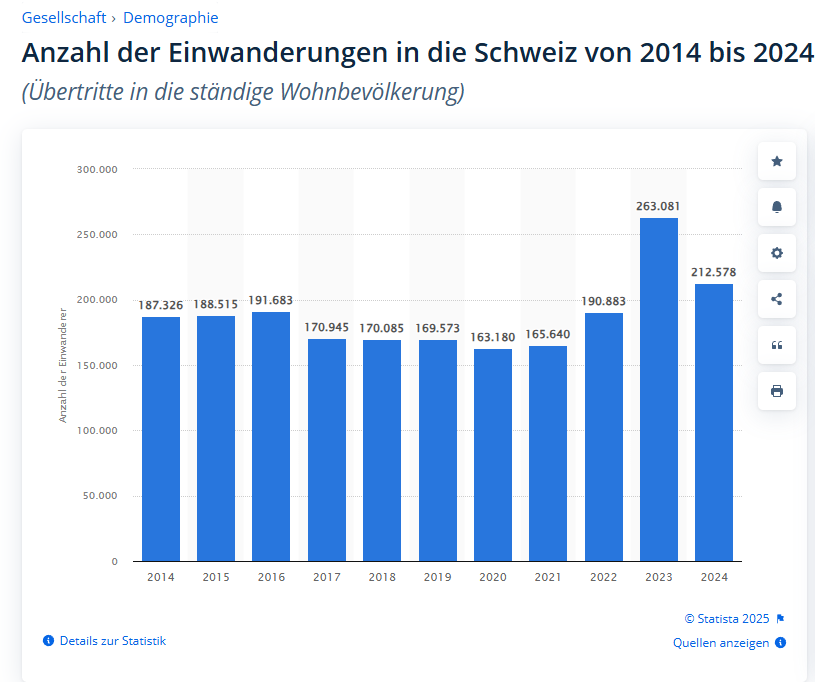 Die Statistik zeigt, dass die Einwanderung in die Schweiz in den letzten zehn Jahren insgesamt zugenommen hat, mit deutlichen Schwankungen zwischen den einzelnen Jahren. Besonders ab 2022 ist ein klarer Anstieg erkennbar, was unter anderem mit wirtschaftlichem Bedarf und globalen Krisen zusammenhängt. Die Zahlen verdeutlichen die Bedeutung von Migration für die demografische Entwicklung der Schweiz.