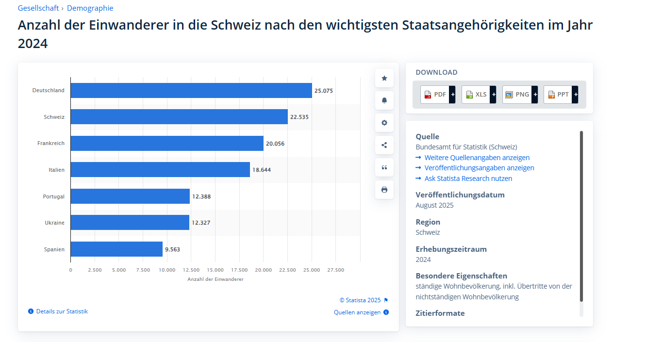 Die Statistik zeigt, aus welchen Ländern die meisten Einwanderinnen und Einwanderer in die Schweiz kommen. Besonders häufig vertreten sind Nachbarländer wie Deutschland, Frankreich und Italien, was auf geografische Nähe und wirtschaftliche Verflechtungen hinweist. Diese Vielfalt prägt das kulturelle Zusammenleben und die Arbeitswelt in der Schweiz nachhaltig.